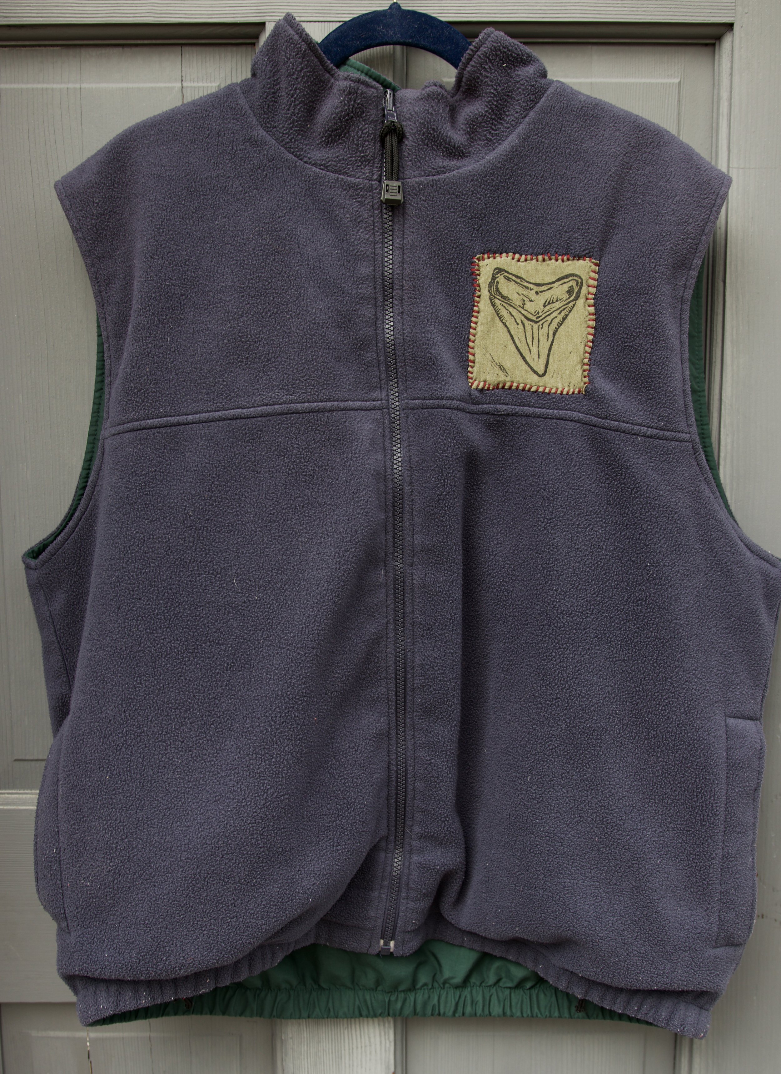 Reversible green and navy vest with hand stitched shark tooth patches on either side. Zipper pockets on the green side and regular pockets on the navy side.